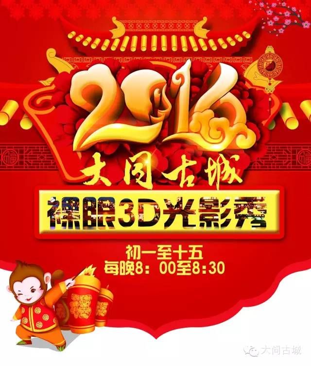 2016春節(jié)期間,由大同市城區(qū)區(qū)委、區(qū)政府和古城管委會(huì)籌備組主辦的大型3D裸眼燈光秀將在古城西城墻廣場(chǎng)上演,為古城增添一道靚麗的夜景。