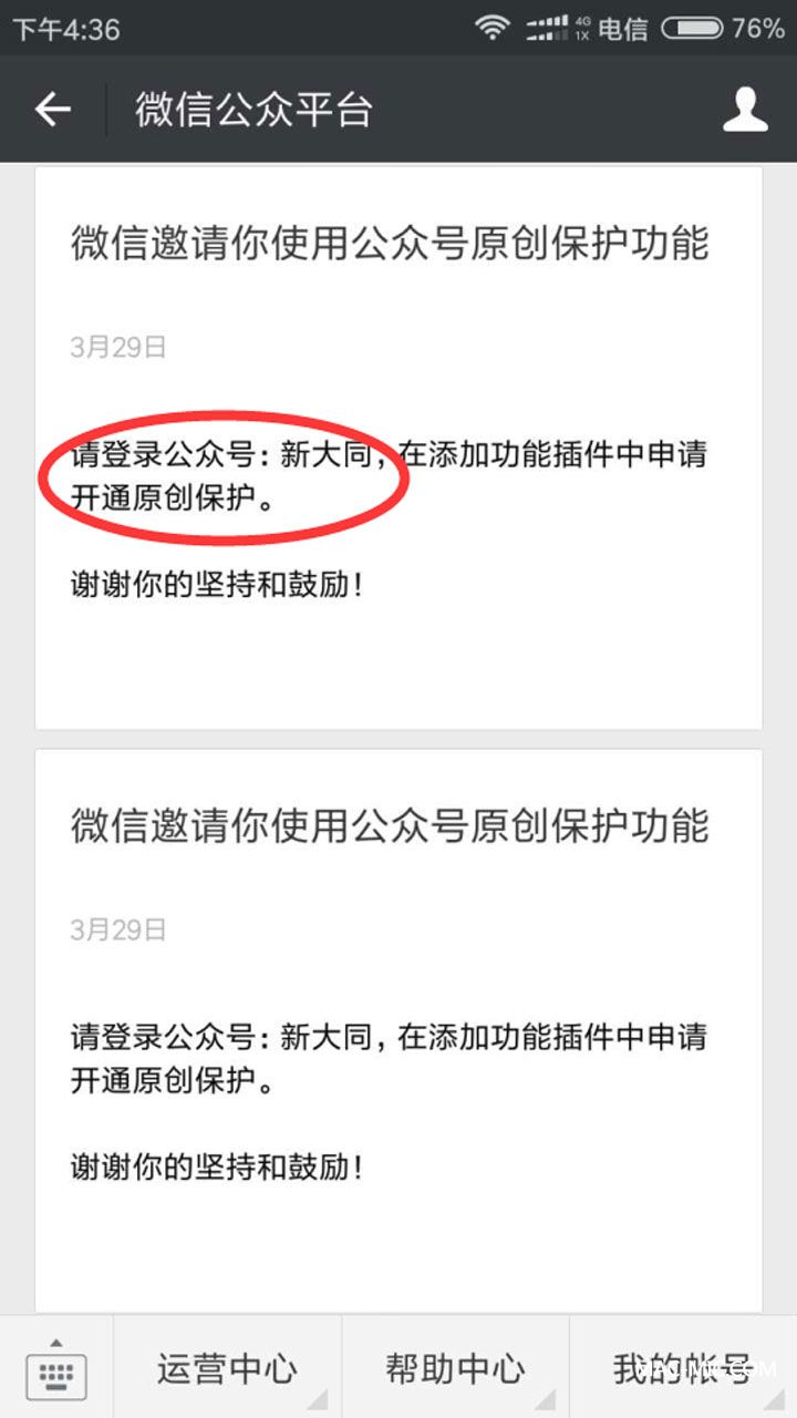 今天下午踏進(jìn)辦公室,剛坐到位置上不久,就聽小編一聲驚呼:“我們獲得微信原創(chuàng)了”,高興的我差點從樓梯上掉下去,果然,“新大同”微信公眾平臺(sxdt_net)成為官方邀請,獲得申請開通“原創(chuàng)聲明”功能。