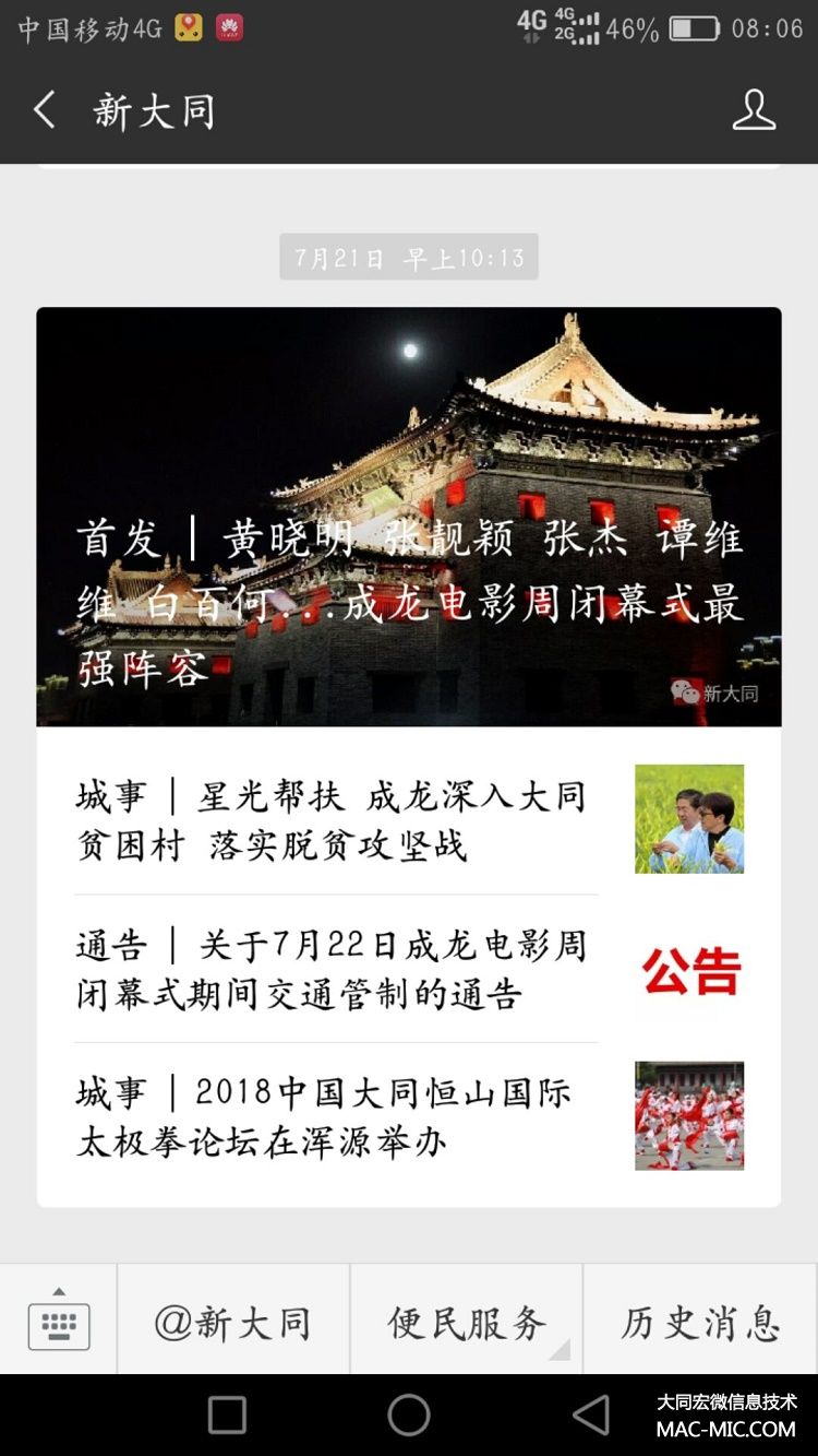 7月21日,由宏微信息技術(shù)旗下新大同微信平臺(tái)首發(fā),新大同網(wǎng)、今日頭條新大同號,搜狐新大同號等全媒體陣容推出的《首發(fā) | 黃曉明 張靚穎 張杰 譚維維 白百何...成龍電影周閉幕式最強(qiáng)陣容》一文在網(wǎng)絡(luò)一經(jīng)推出就開始熱傳。成龍電影周在大同舉辦,閉幕式廣受關(guān)注,新大同內(nèi)容發(fā)送及時(shí),內(nèi)容獨(dú)特,編排新穎,受到眾多關(guān)心大同旅游發(fā)展、關(guān)系成龍動(dòng)作電影節(jié)的網(wǎng)友一致好評。