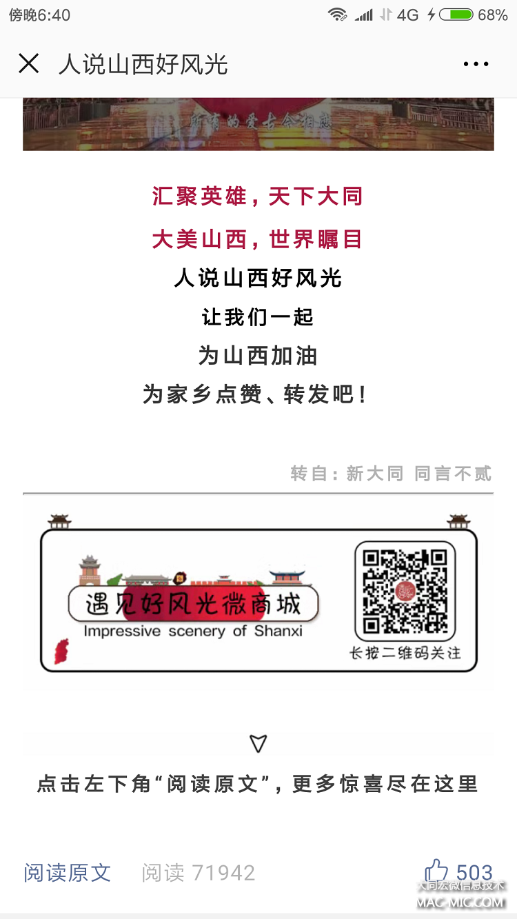 截止發(fā)稿時(shí),新大同原創(chuàng)微文《首發(fā) | 黃曉明 張靚穎 張杰 譚維維 白百何...成龍電影周閉幕式最強(qiáng)陣容》在人說山西好風(fēng)光的閱讀量已經(jīng)達(dá)到7W+,新大同平臺(tái)通過不斷完善創(chuàng)新發(fā)展,為我們大同旅游、為山西旅游發(fā)展不斷貢獻(xiàn)自己的小小力量。