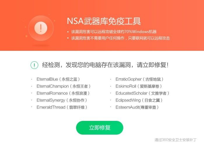 針對NSA黑客武器利用的Windows系統(tǒng)漏洞,微軟在今年3月已發(fā)布補丁修復。此前360安全中心也已推出“NSA武器庫免疫工具”,能夠一鍵檢測修復NSA黑客武器攻擊的漏洞;對XP、2003等已經(jīng)停止更新的系統(tǒng),免疫工具可以關(guān)閉漏洞利用的端口,防止電腦被NSA黑客武器植入勒索病毒等惡意程序。